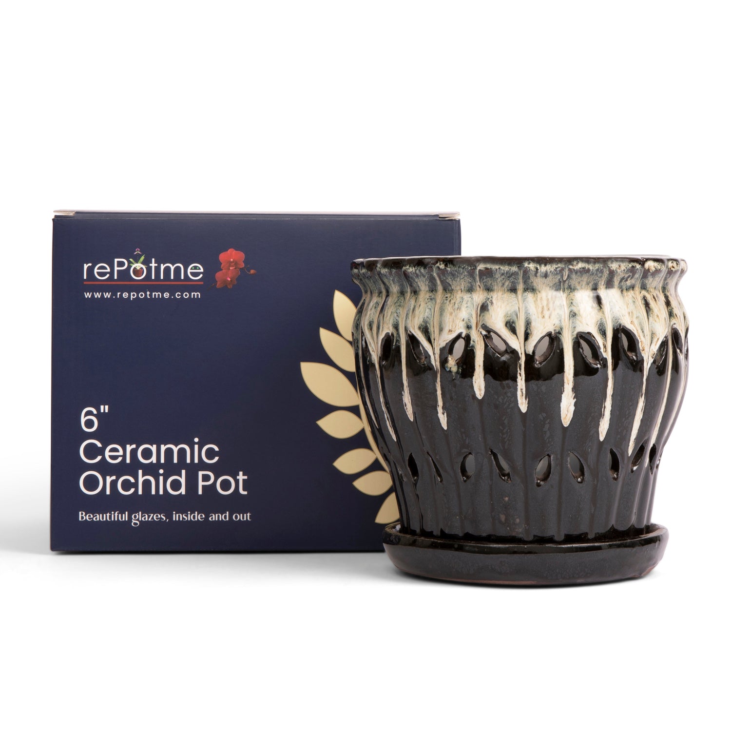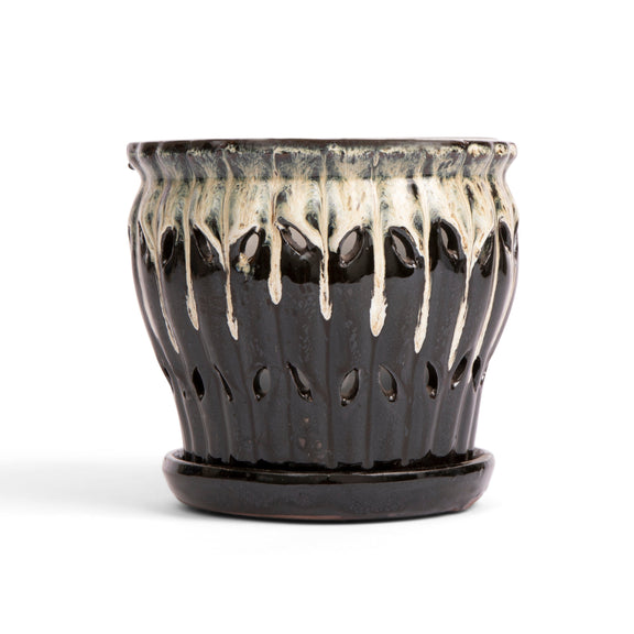 Our spectacular hand glazed ceramic orchid pots are available in five generous diameters, 6”, 7”, 8”, 9”, and 10”. These are no ordinary ceramic orchid pots, as they are custom made for us and designed to fit with our free included clear plastic inserts. The inserts help protect that incredible glazed finish while channeling water to the attached drip tray while still allowing light to reach roots for photosynthesis. The included inserts keep roots from protruding through the side openings of the ceramic pot as well, and make it easy to lift the plant out to examine roots systems and moisture levels. Each of these works of art are glazed inside and out and the base comes with soft pads attached to protect surfaces and furniture. Stunningly beautiful, with a deep and rich glaze, these gorgeous pots will protect and show off your wonderful plants for many years to come.
