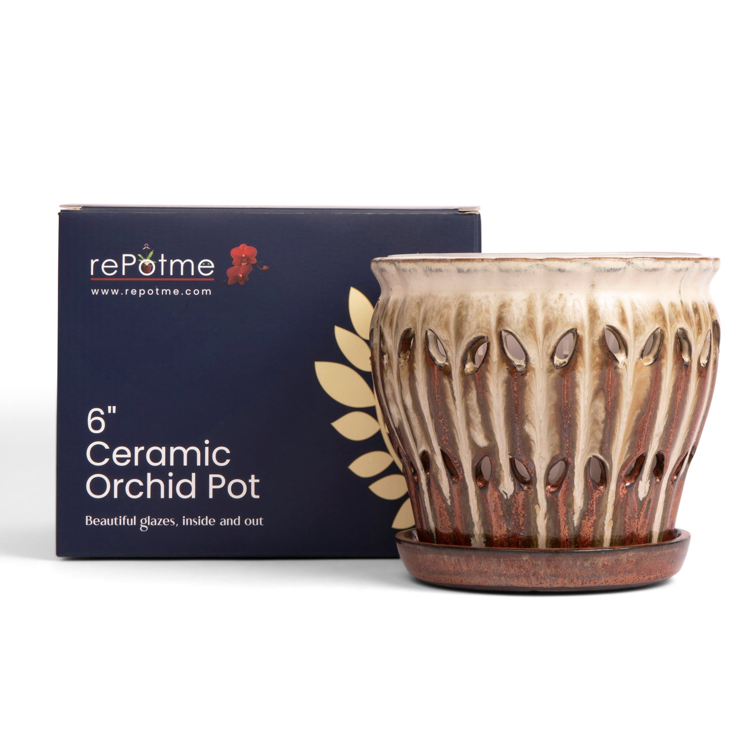 Our spectacular hand glazed ceramic orchid pots are available in five generous diameters, 6”, 7”, 8”, 9”, and 10”. These are no ordinary ceramic orchid pots, as they are custom made for us and designed to fit with our free included clear plastic inserts. The inserts help protect that incredible glazed finish while channeling water to the attached drip tray while still allowing light to reach roots for photosynthesis. The included inserts keep roots from protruding through the side openings of the ceramic pot as well, and make it easy to lift the plant out to examine roots systems and moisture levels. Each of these works of art are glazed inside and out and the base comes with soft pads attached to protect surfaces and furniture. Stunningly beautiful, with a deep and rich glaze, these gorgeous pots will protect and show off your wonderful plants for many years to come.