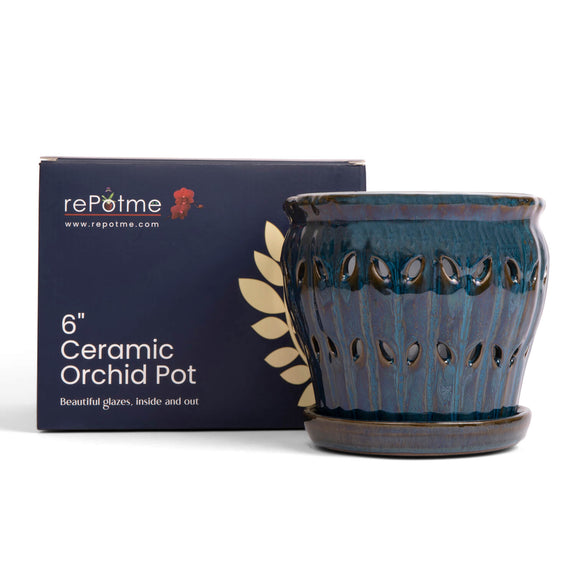 Our spectacular hand glazed ceramic orchid pots are available in three generous diameters, 6”, 8” and 10”. These are no ordinary ceramic orchid pots, as they are custom made for us and designed to fit with our free included clear plastic inserts. The inserts help protect that incredible glazed finish while channeling water to the attached drip tray while still allowing light to reach roots for photosynthesis. The included inserts keep roots from protruding through the side openings of the ceramic pot as well, and make it easy to lift the plant out to examine roots systems and moisture levels. Each of these works of art are glazed inside and out and the base comes with soft pads attached to protect surfaces and furniture. Stunningly beautiful, with a deep and rich glaze, these gorgeous pots will protect and show off your wonderful plants for many years to come.