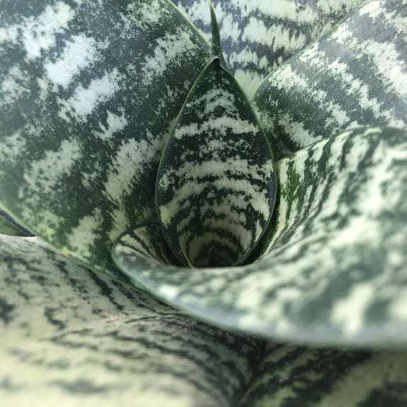 SANSEVIERIA tri. 'Black Coral'. 24-36" tall, 12-18" spread, bright: indirect light. Tall, upright sword-like leaves are dark green with wavy, silver horizontal banding that gives each blade a subtle contrast. Highly drought tolerant and very easy to grow. Zones 9b-12. Potted in 3" pot. Typically grown indoors.