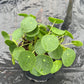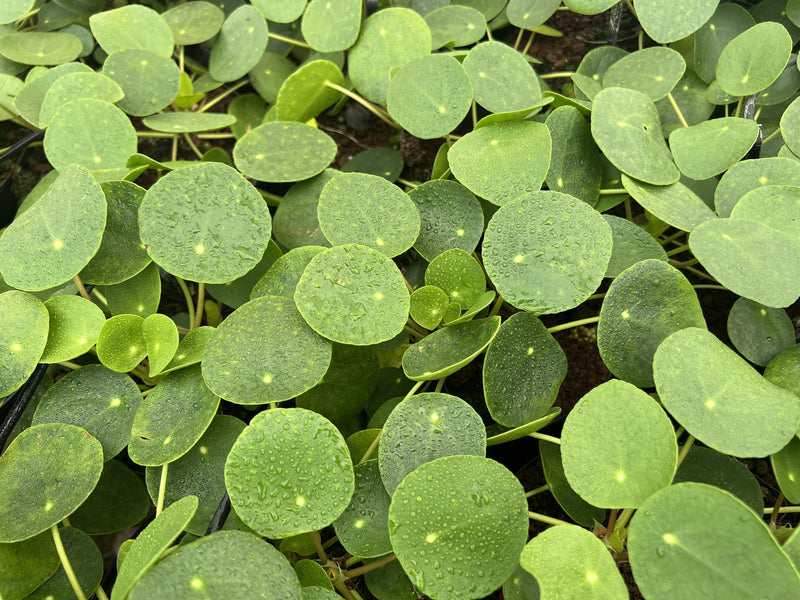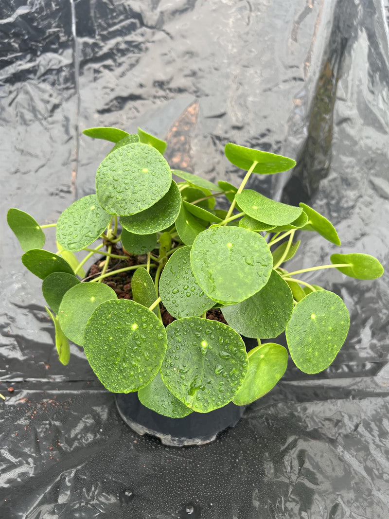 PILEA peperomioides. 8-12" tall, 8-16" spreads, bright; indirect light but should be protected from direct sunlight. Unique, coin-shaped, glossy green leaves that grow on long, slender petioles. Blooms occasionally in spring or early summer, mature plants may produce tiny white or pale pink flowers on long, thread-like stems, though the blooms are modest and not the main attraction. Prefers well-draining soil and regular watering, allowing the top inch of soil to dry out between waterings. Zones 10-12, it is most often grown indoors in cooler regions. Potted in 3" pot.