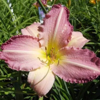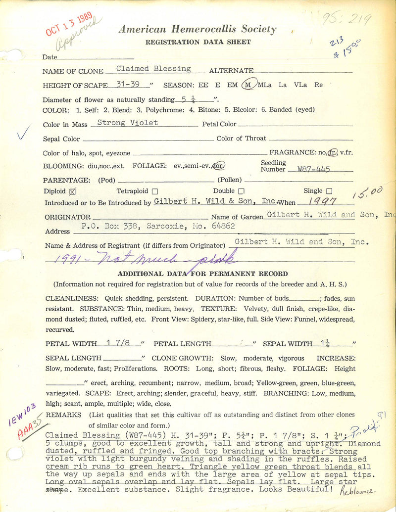 height 35 inches (89 cm), bloom 5.25 inches (13 cm), season M, Rebloom, Dormant, Diploid, Fragrant, Diamond dusted strong violet veined and shaded burgundy with raised cream midribs and yellow green throat.