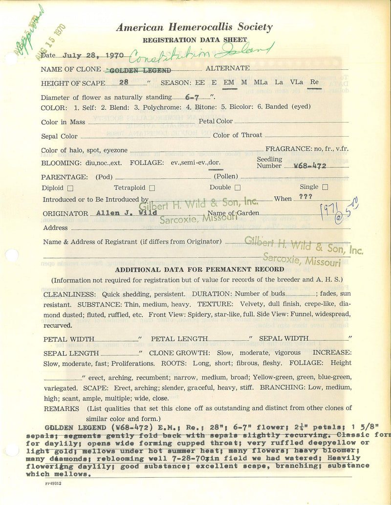 height 28 inches (71 cm), bloom 6.5 inches (17 cm), season EM, Rebloom, Dormant, Diploid, Light gold self.