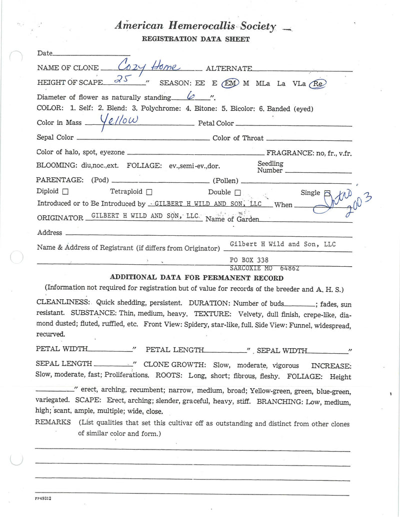 height 25 inches (64 cm), bloom 6 inches (15 cm), season EM, Rebloom, Dormant, Diploid, Yellow self above yellow green throat.