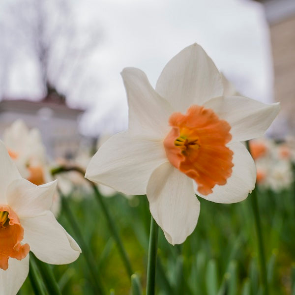 Daffodil Accent - 16-18" tall, full sun-light shade, mid-spring bloom. 4" ivory-white petals with a contrasting deep salmon-pink frilled funnel shaped cup. Vigorous grower. Zones 3-8. 12-14cm bulb. 5 bulbs per package.
