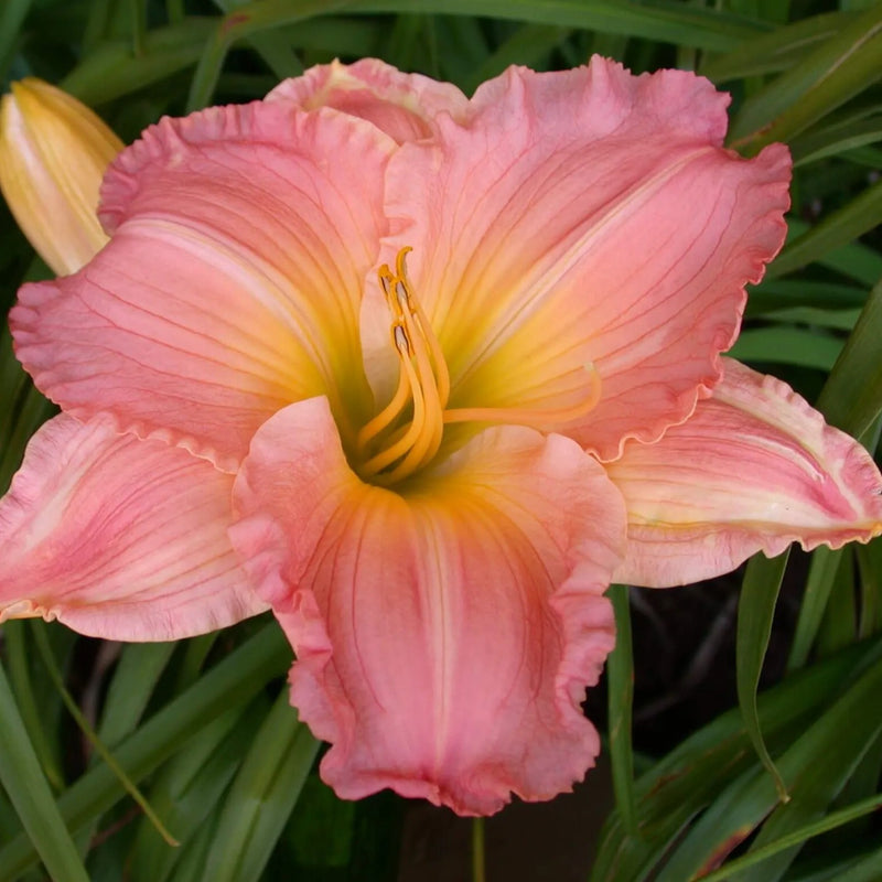 height 24 inches (61 cm), bloom 6.75 inches (17 cm), season EM, Rebloom, Dormant, Diploid, Light rose with raised pink midribs and wide yellow green throat.
