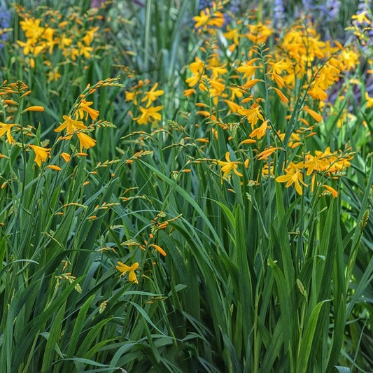 The narrow, green, erect, sword shaped leaves of the Crocosmia are beautiful enough on its own but wait until midsummer and these plants will explode with color through late summer. Drought tolerant once established. Attracts hummingbirds and are deer and rabbit resistant. Zones 5-9. 8/10cm corm.