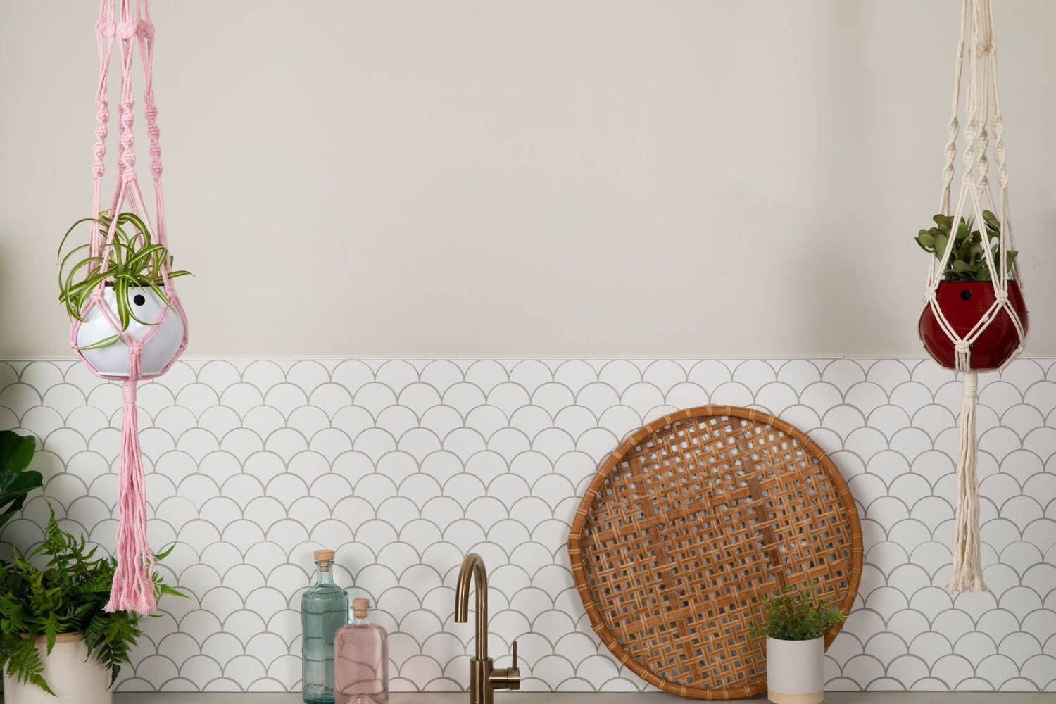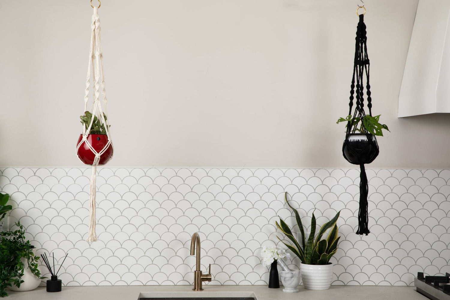 Macrame Hanger Self Watering Set - Linen White + Ruby Red