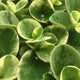 PEPEROMIA obtusifolia 'Marble'. 8-12" tall, 8-10" spread, bright-indirect light, occasional blooms throughout the year. Thick, glossy, spoon-shaped leaves marbled with creamy yellow, green, and sometimes hints of white. Blooms are slender, tail-like flower spikes that are pale green to white, though they are subtle. Too little light may reduce its variegation. Prefers warm indoor temperatures, moderate humidity, and well-draining soil that should be allowed to dry partially between waterings. Its easy going nature and vibrant foliage make it a popular choice for desktops, shelves or mixed houseplant displays. Zones 10-12. Potted in 3" pot.