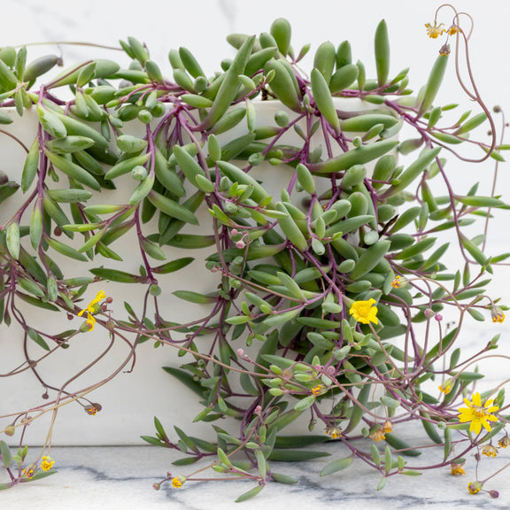 SENECIO 'Purple Flush'. 1-12" tall, 12-18" spread, full sun-partial shade. Prized for its plump banana‑shaped, succulent leaves that flush rich purple hues. Grows on slender, trailing stems that can cascade over the edges of containers or spread across the ground, creating a dense, colorful mat. Zones 10-12. It should be protected from frost and brought indoors in colder climates. Potted in 3" pot.