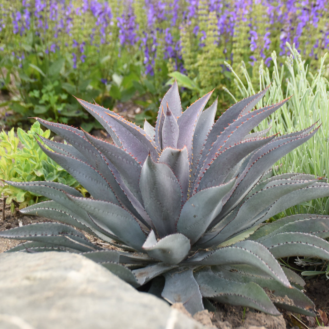 MANGAVE 'Purple People Eater' PP29949 ART & SOL® Collection. 12-16" tall, 16-24" spread, full sun. A neat rosette of thick, sturdy leaves that are blue-green with reddish-purple spotting. However, while walking by, the color will look purple. Bring out its best coloration in full sun; less intense exposure will produce greener leaves. Margins fold upward to show off its yellow, orange, and cinnamon brown spines. At the end of each leaf, there is a cinnamon terminal spine. Deer and rabbit resistant. Slow Growing. Zones 9-11. Potted in 3" pot.
