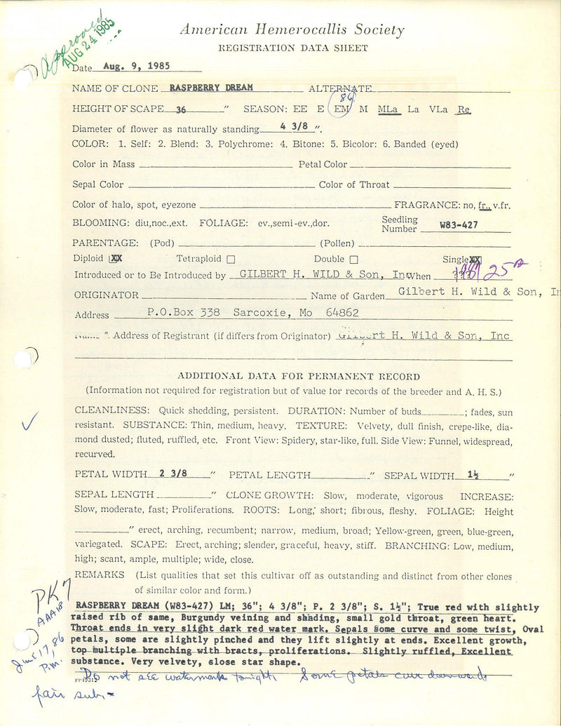 height 36 inches (91 cm), bloom 4.37 inches (11 cm), season MLa, Rebloom, Dormant, Diploid, Fragrant, Red veined burgundy with dark red watermark and small green gold throat.