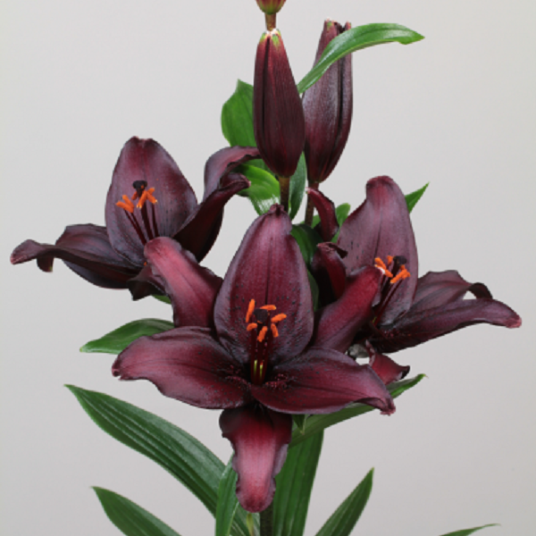 Lily Secret Kiss - Asiatic. 2-3' tall with early summer bloom. One of the darkest on the market! Dark purple-red to almost black with orange anthers and dark stems. Slightly fragrant. 14/16cm bulb. Plant in full sun. Zones 3-10. 3 bulbs per package.