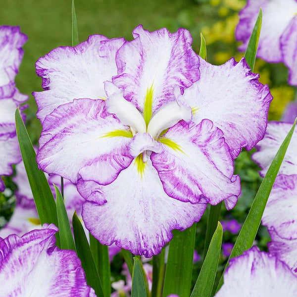 Iris Tiramisu Dinner Plate Japanese - 36-40” tall. Early summer bloom. Large 6” double, clean white petals are speckled and edged in lavender pink. Bright yellow signals draw your eye in to this spectacular bloom. Zones 4-9. Potted in 3” pot.