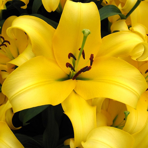 Lily Yelloween - Orienpet. 3-4' tall with mid-late summer bloom. Satiny, primrose yellow petals have a lime green throat. Fragrant.